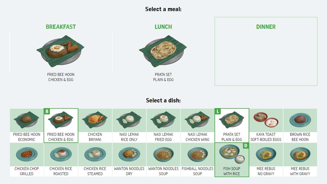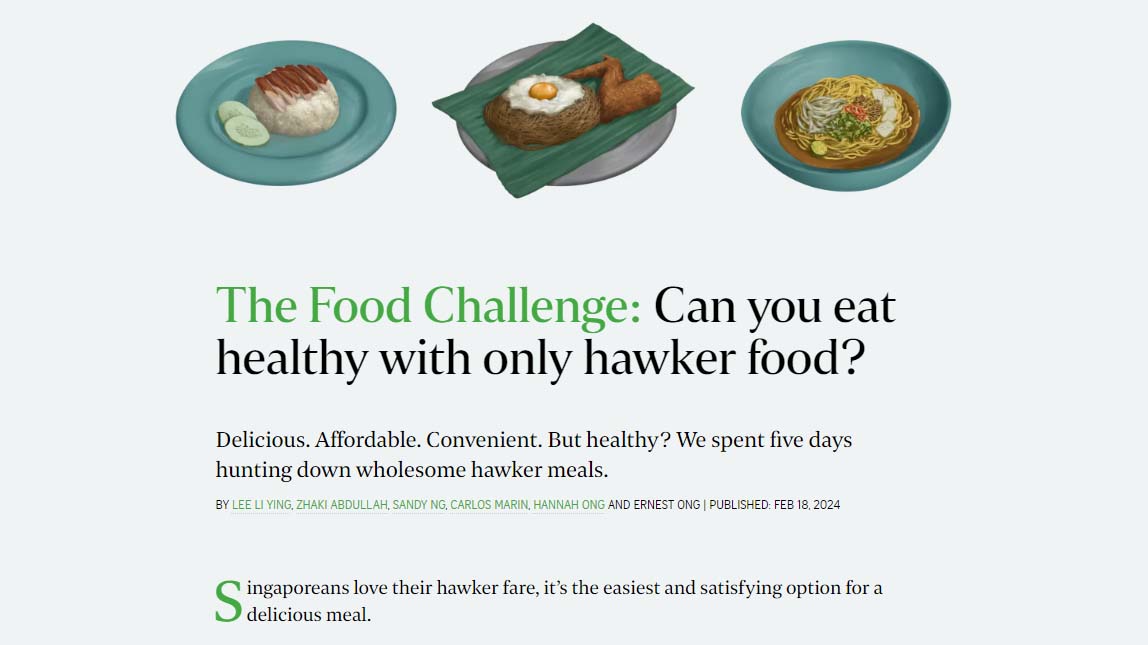 A series of food illustrations for an article about affordable healthy eating at Singaporean food courts.