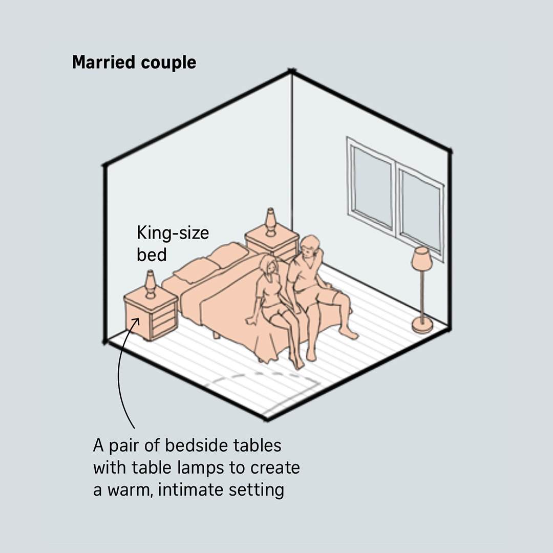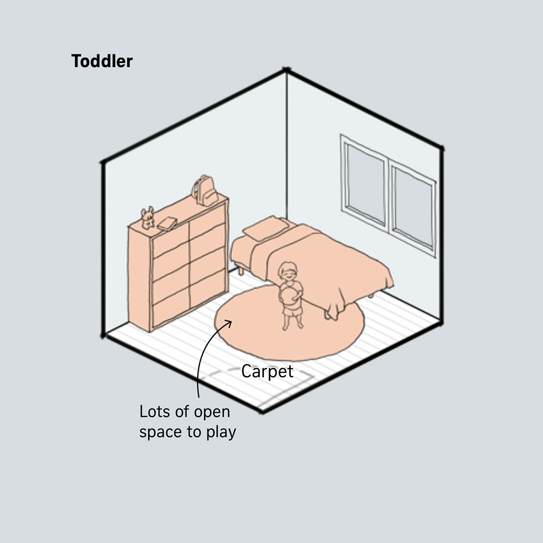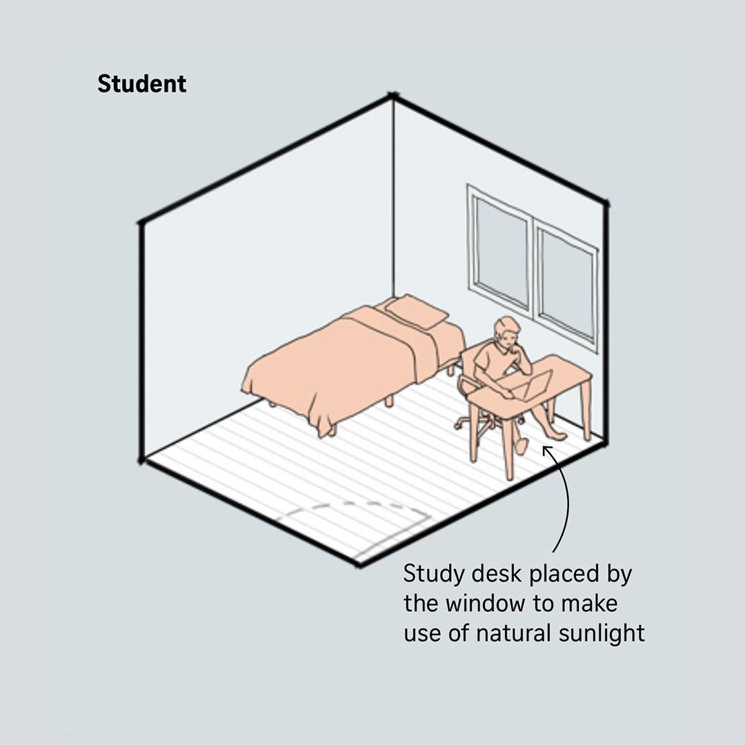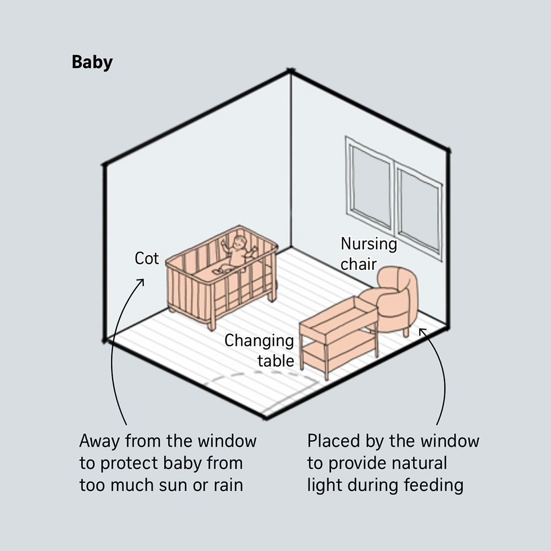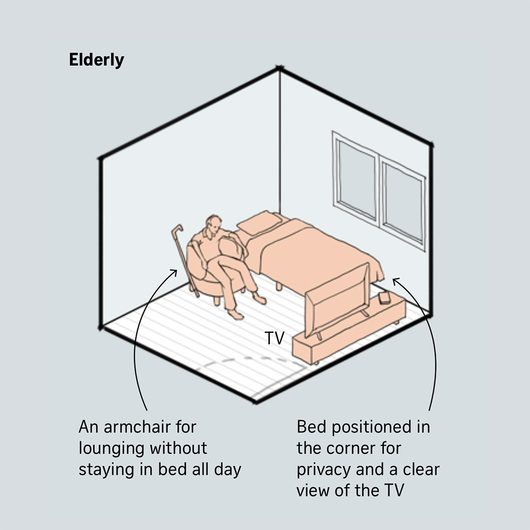 Illustrations to visualise how a bedroom could be used differently depending on the occupant's stage of life.